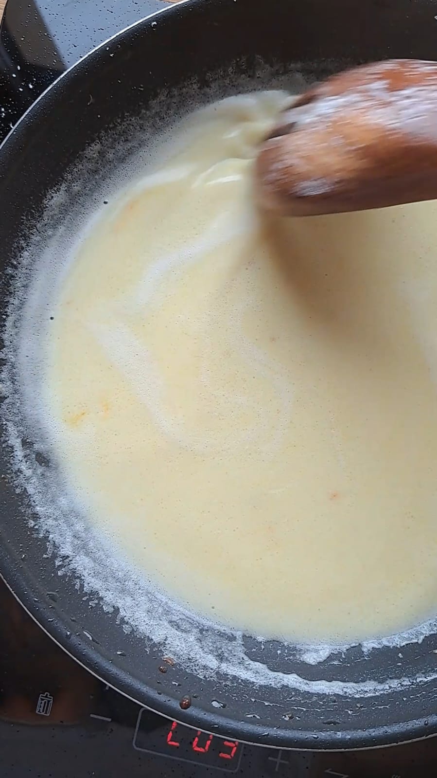 Now prepare the sauce: in a non-stick pan, fry the pancetta until crispy and the fat has rendered out. Once cooked, remove the cubes and set them aside. In the same pan, add the grated Parmigiano Reggiano, the milk (or cream, if you prefer), season with a pinch of pepper and a teaspoon of turmeric powder (to mimic the color of egg), and let the Parmesan sauce thicken until nice and creamy.