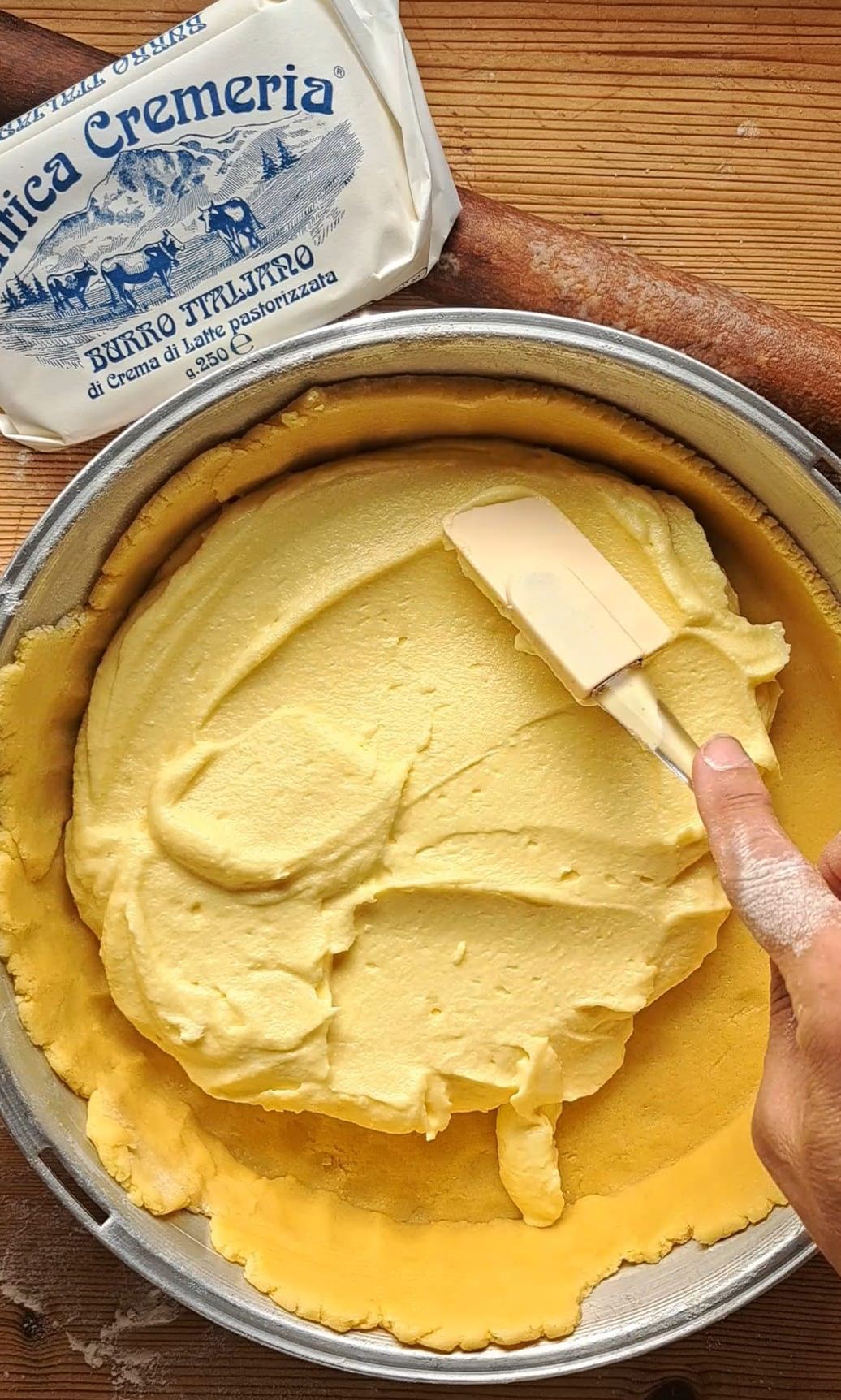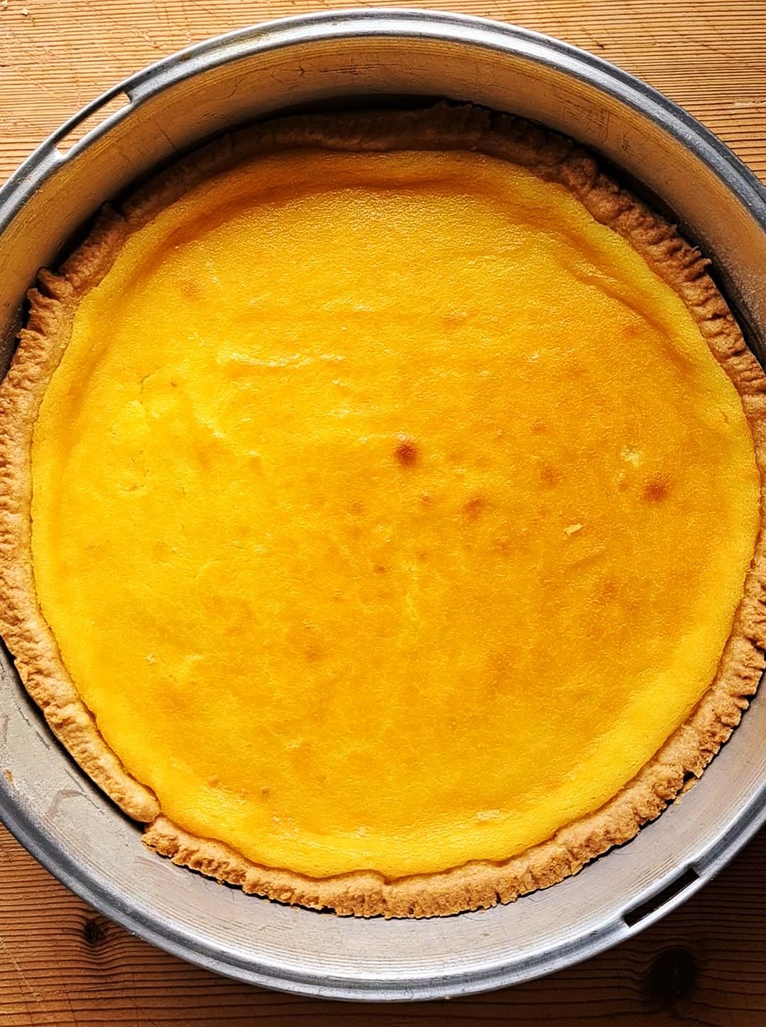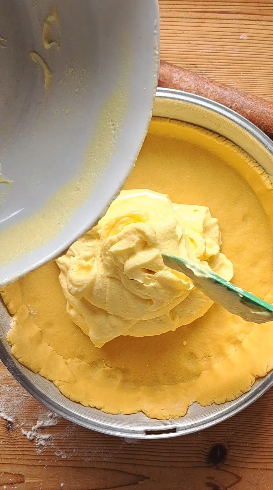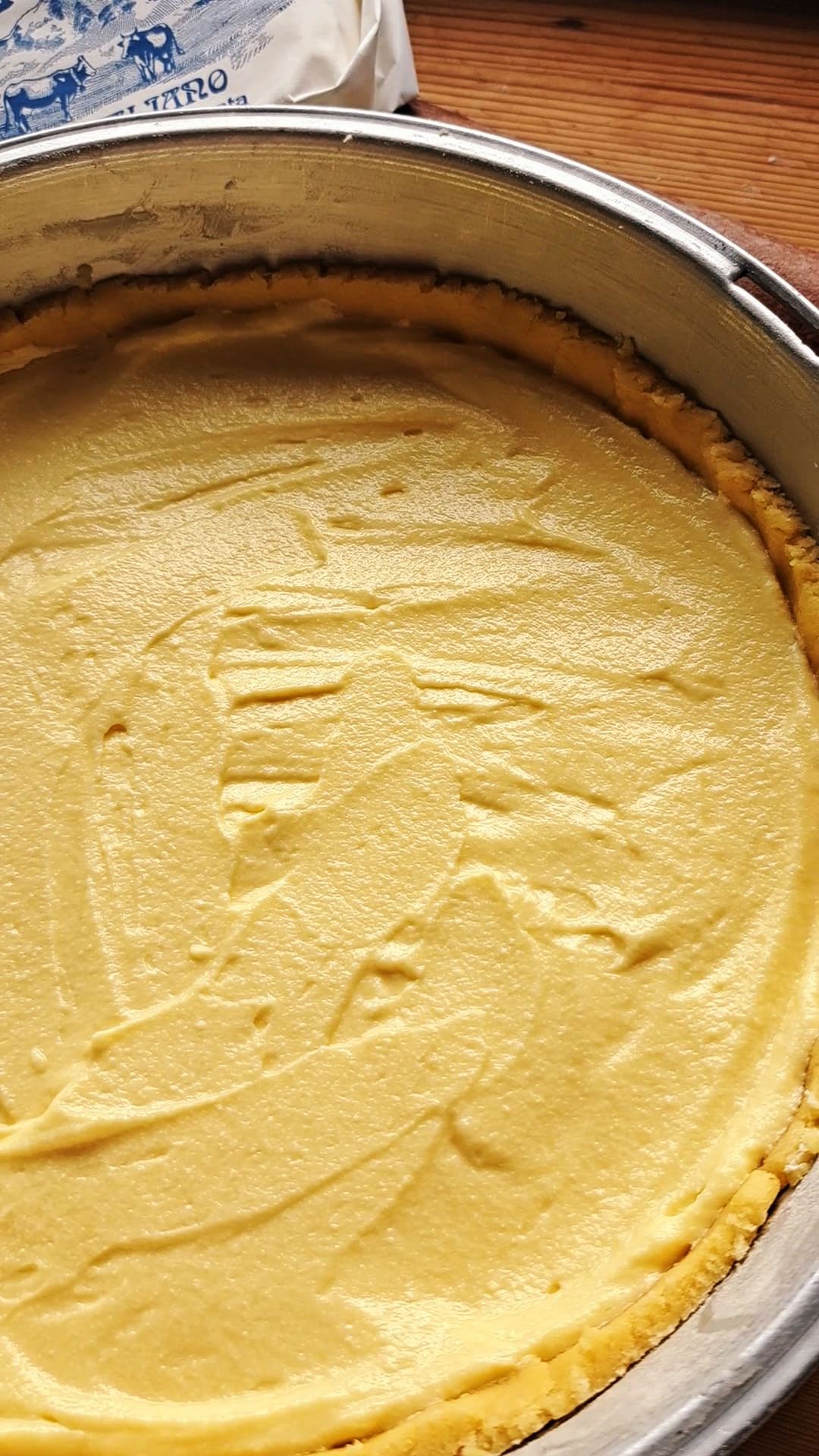 Imburriamo e infariniamo la teglia, stendiamo la frolla, pareggiamo i bordi lasciano almeno due dita di bordo laterale e versiamo la crema di ricotta, livellandola con una spatola.