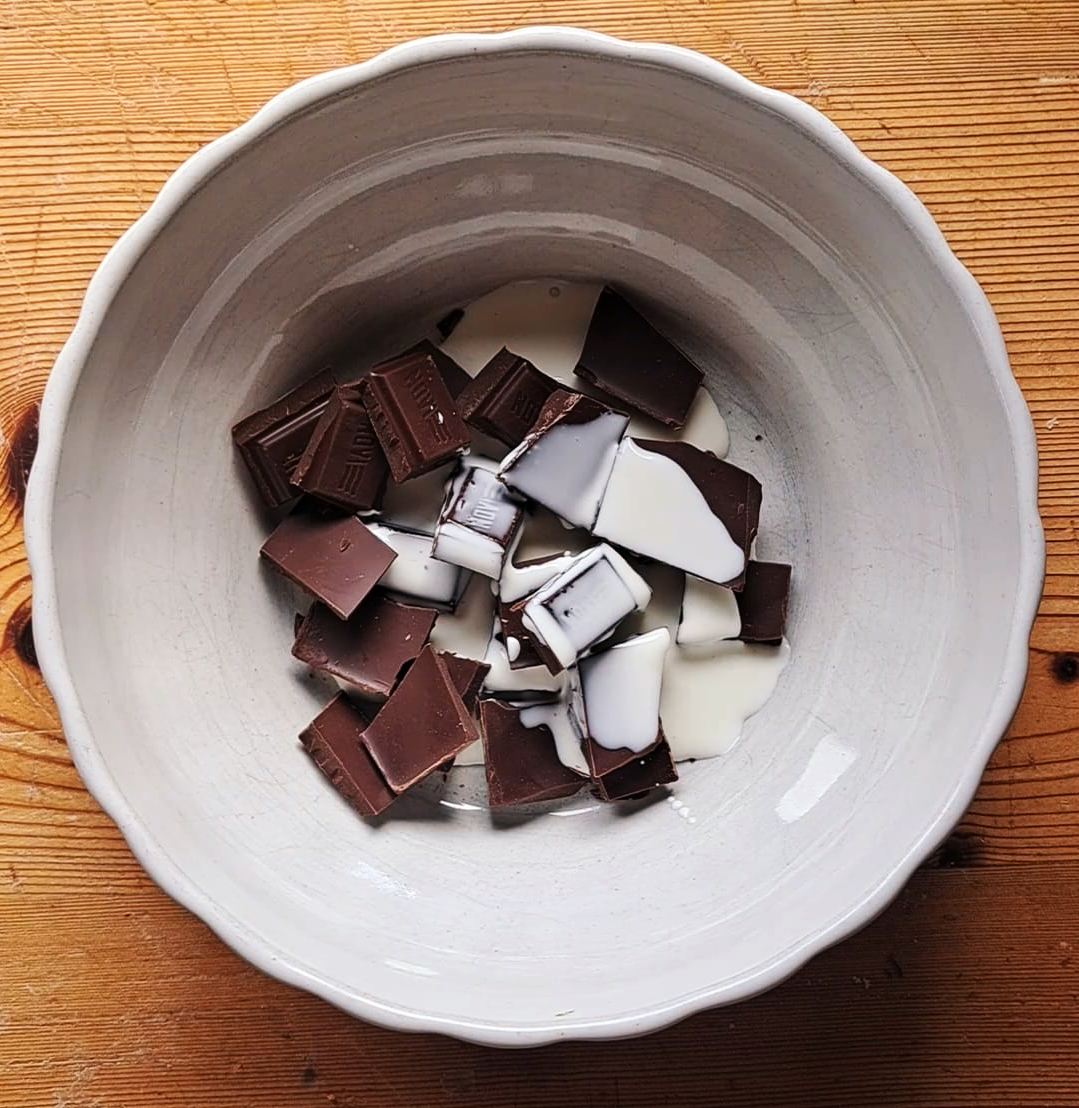 Spezzettiamo il cioccolato e versiamo la panna, facciamo scaldare al microonde (oppure a bagnomaria) mescolando continuamente, fino al ottenere una bella copertura lucida.