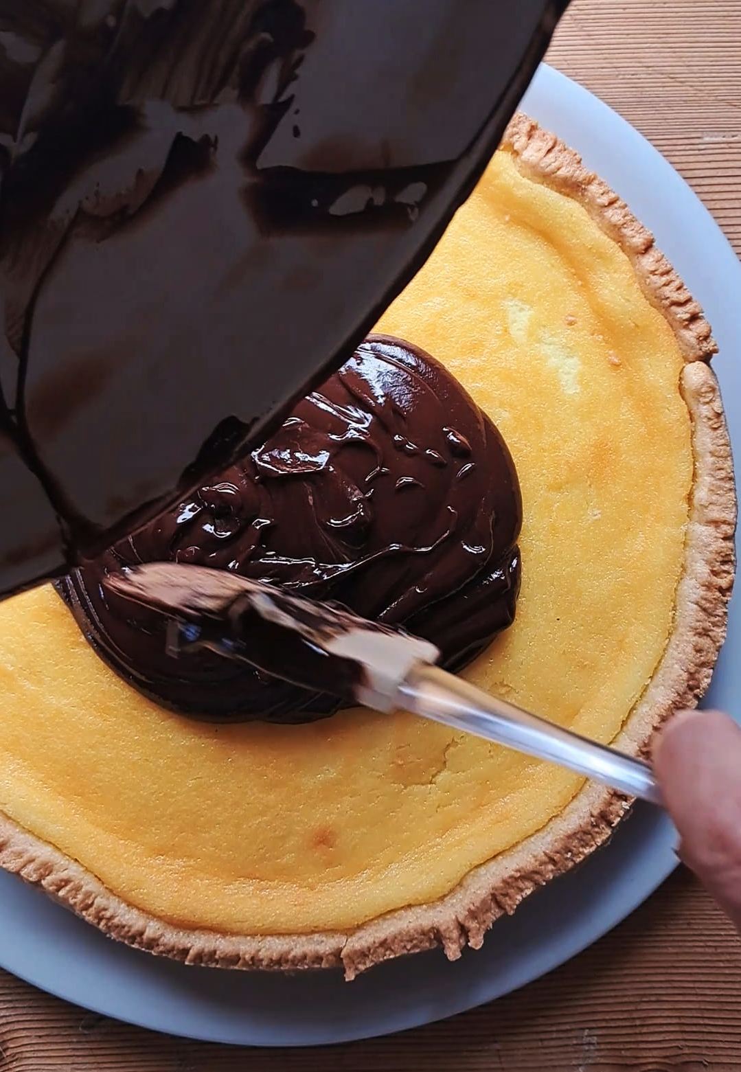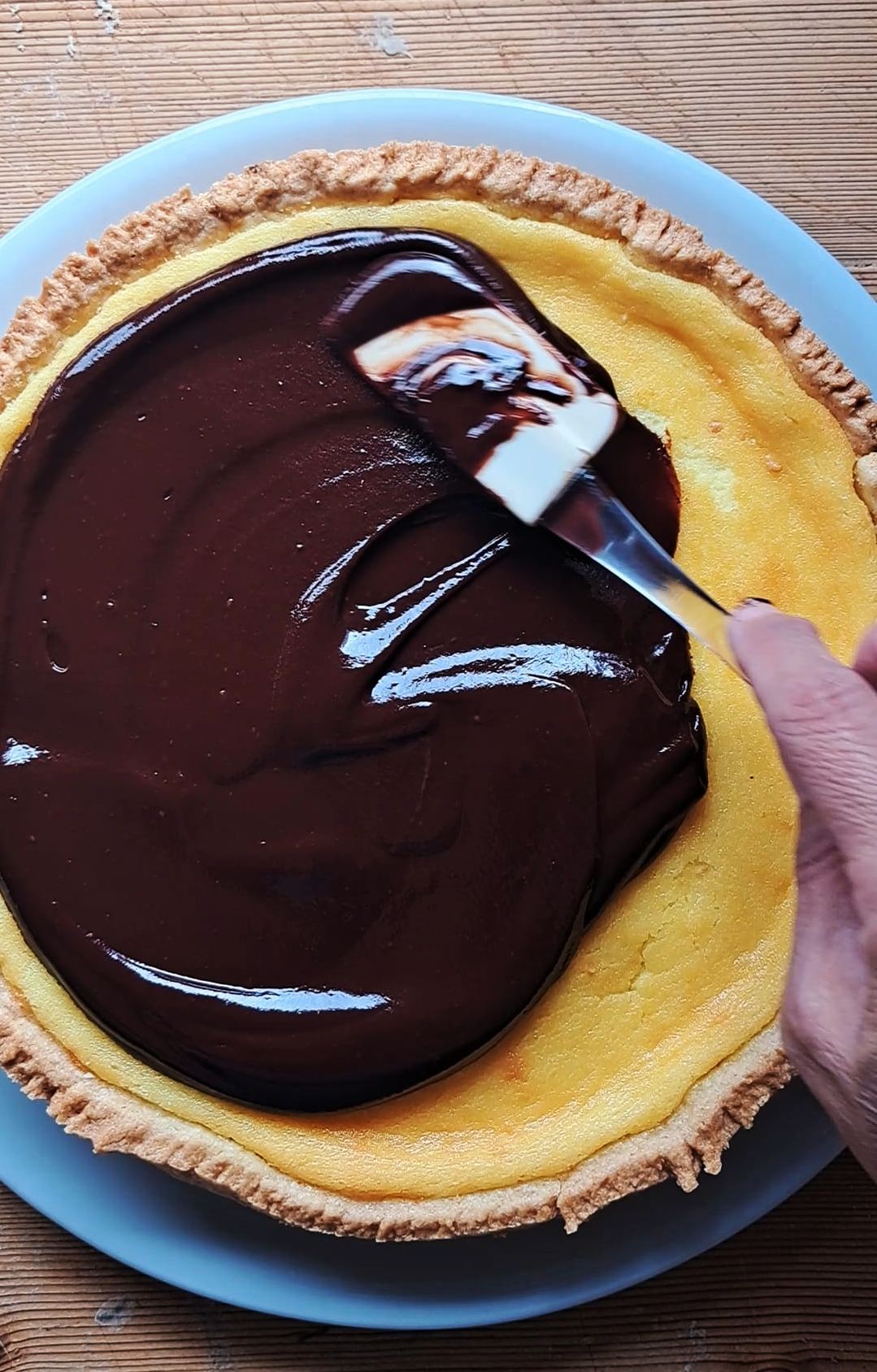 Coliamo il cioccolato sulla torta e livelliamo la superficie con la spatola. La presenza della panna permetterà di tagliare la copertura senza che il cioccolato indurisca troppo.