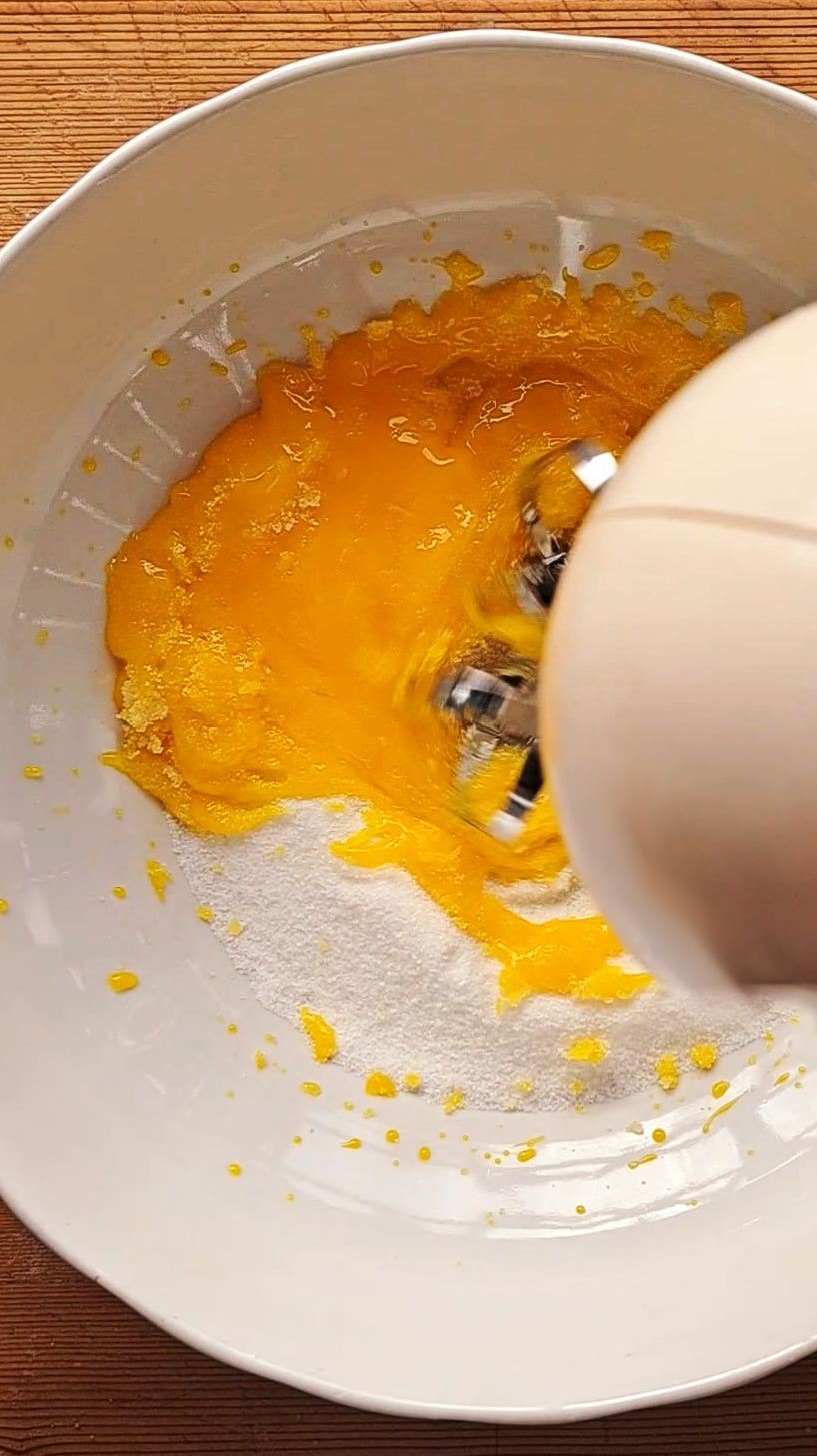 Montare con le fruste elettriche i tuorli con lo zucchero fino ad ottenere una bella crema spumosa.
